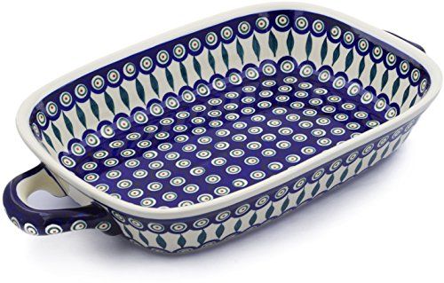 Polish Pottery 18-inch Rectangular Baker with Handles (Peacock Leaves Theme) + Certificate of Authenticity through an online shopping site.